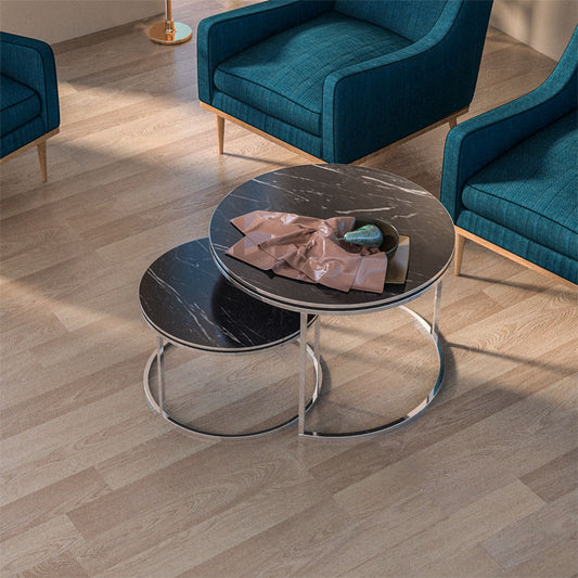Τραπέζια σαλονιού Ygron PW σετ 2τεμ μαύρο μαρμάρου-ασημί