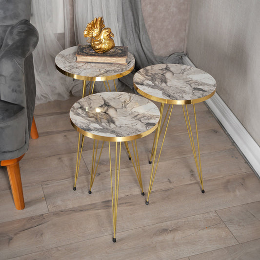 Βοηθητικά τραπέζια Klyntar PW σετ 3τεμ λευκό μπεζ μαρμάρου μελαμίνης-χρυσό μέταλλο